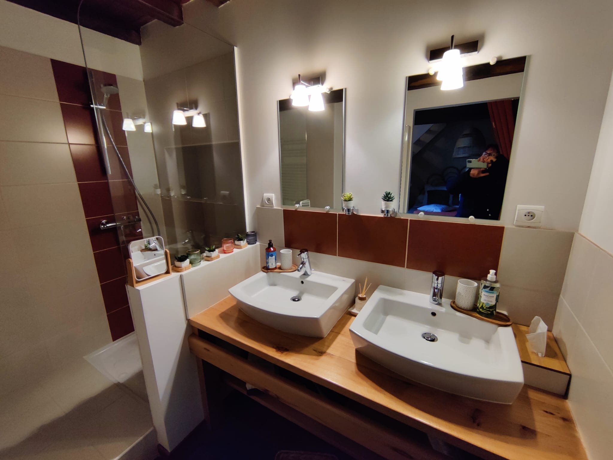 Douche, WC, 2 lavabos
