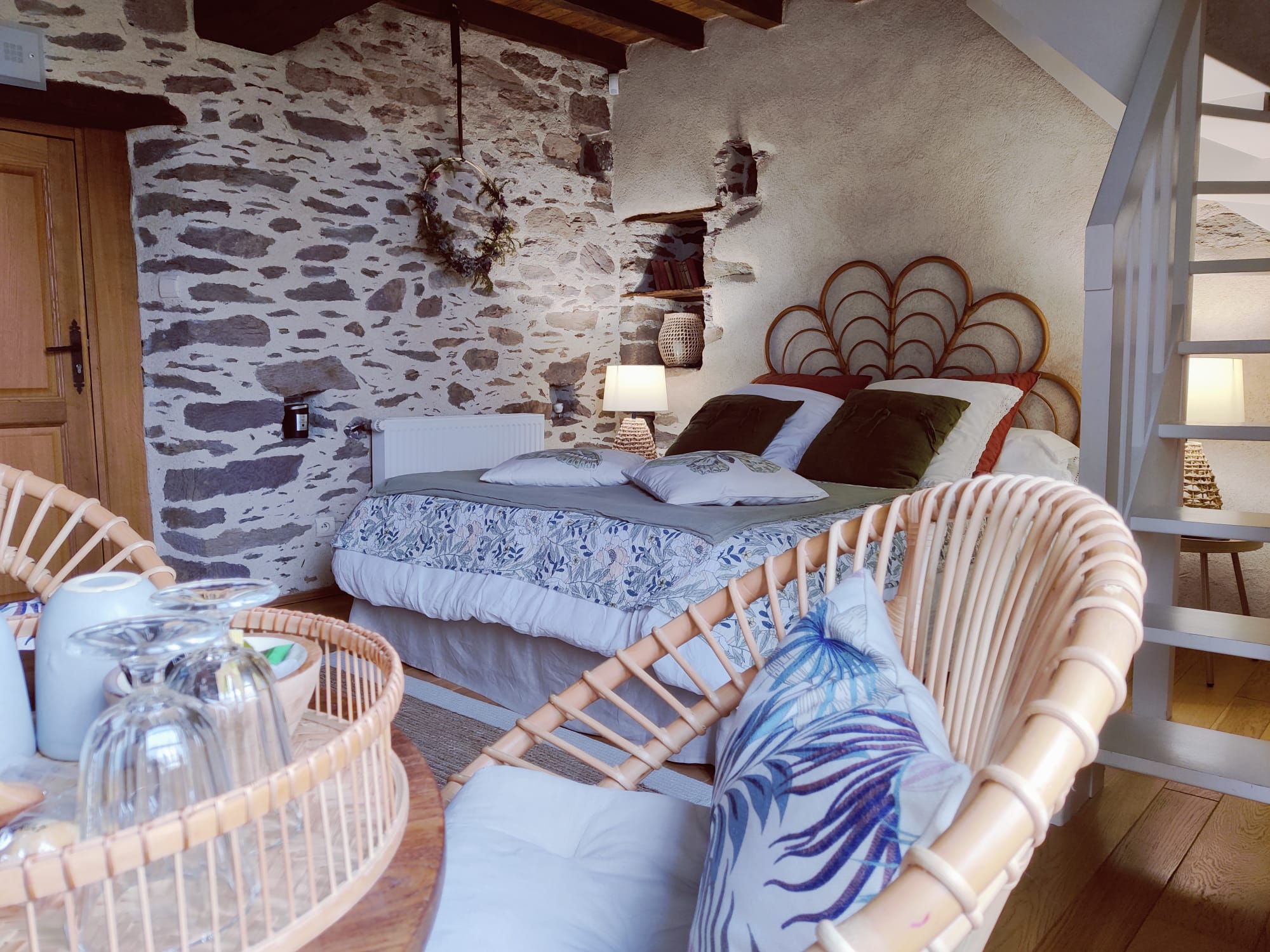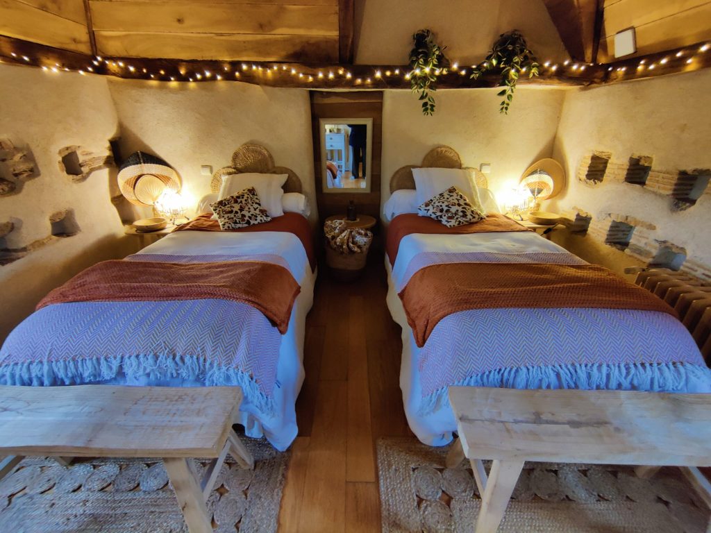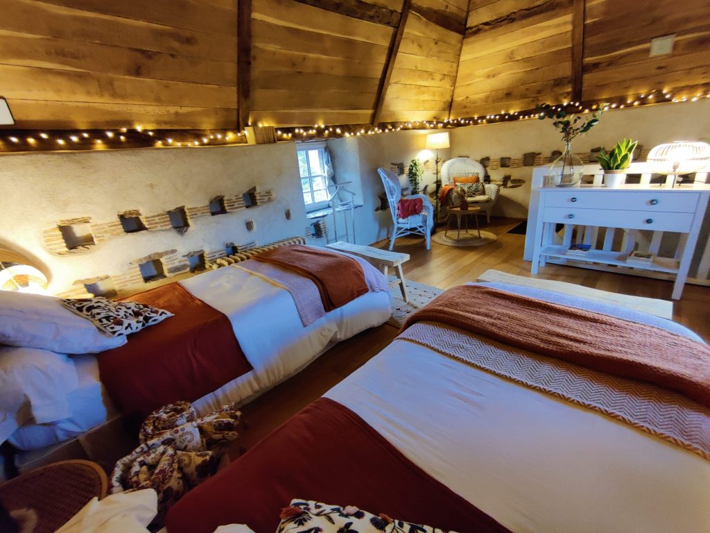 Cette magnifique chambre en duplex ne vous laissera pas insensible avec ses murs en pierre et chaux, son parquet en chêne, ses poutres d’époque et sa charpente en chêne . Située dans l’ancien pigeonnier du manoir, restaurée avec élégance, on peut encore y voir les « boulins », ces petit trous dans le mur servant autrefois de nid pour les pigeons.